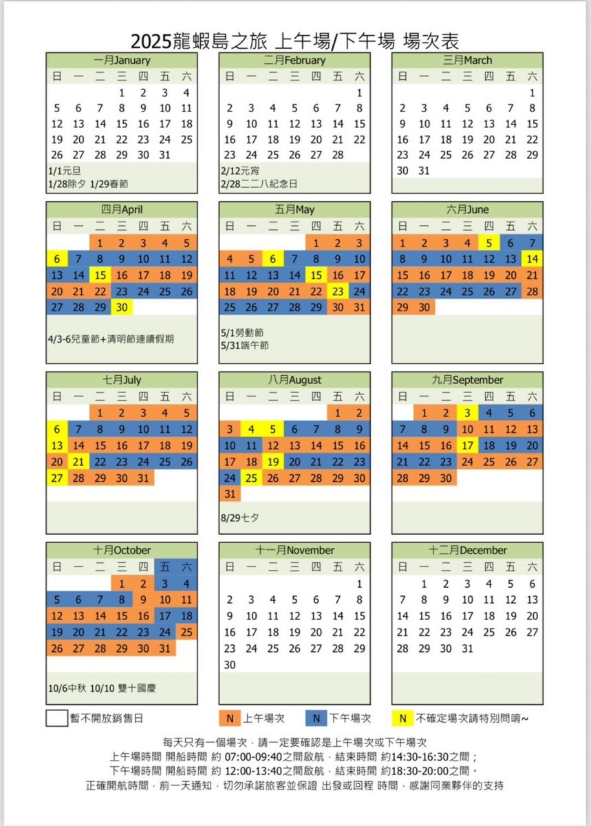 ※ (農曆11日~18日+26日~3日) 下午場:12:00~13:30之間啟航,19:30~20:30結束